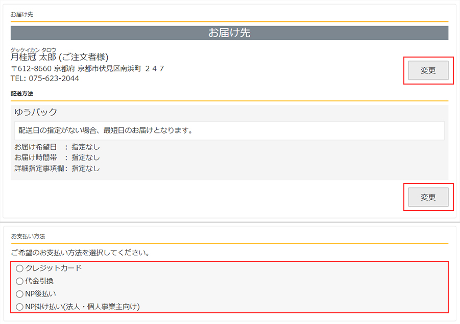 お届け先のご変更やお届け日時のご指定は「変更」ボタンを押してください。