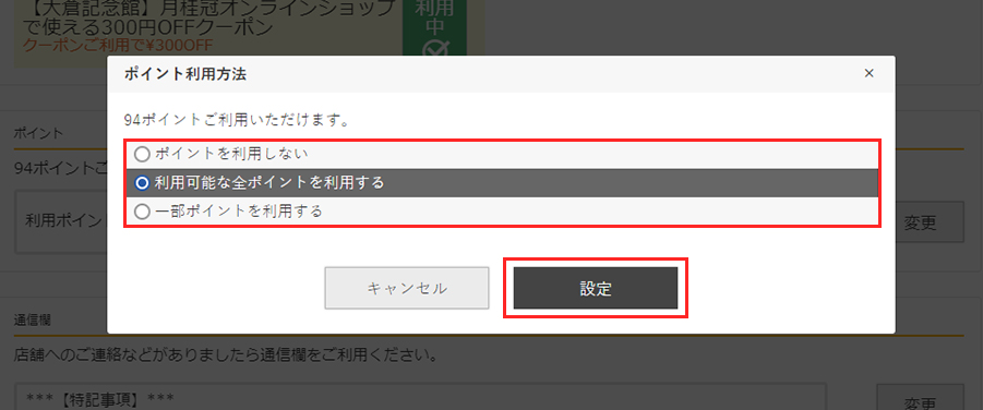 また、ポイントやクーポンをご使用される場合には、こちらの画面よりご指定ください。
