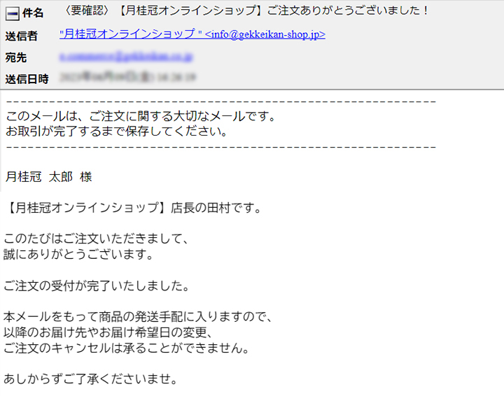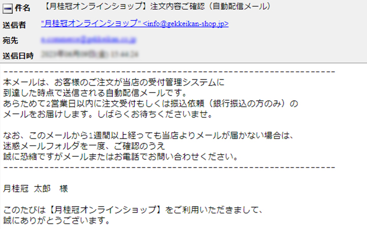 受付が完了したら、当店より「件名:ご注文ありがとうございました」をお送りします。