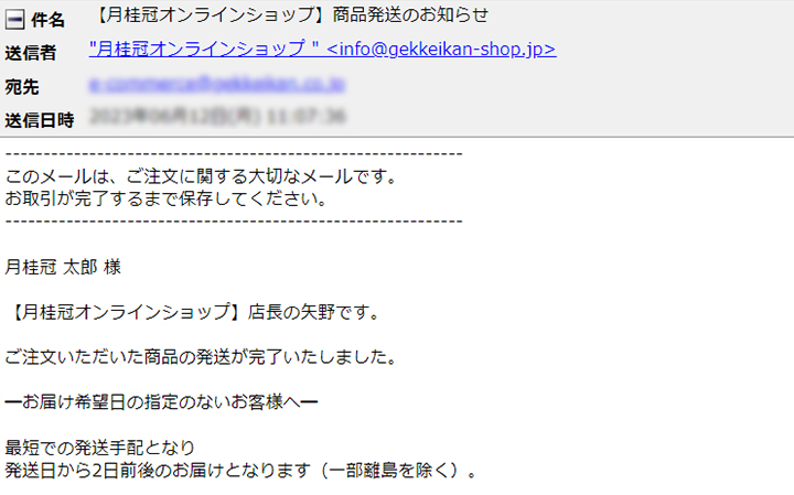 発送が完了したら、当店より「件名:商品発送のお知らせ」をお送りします。